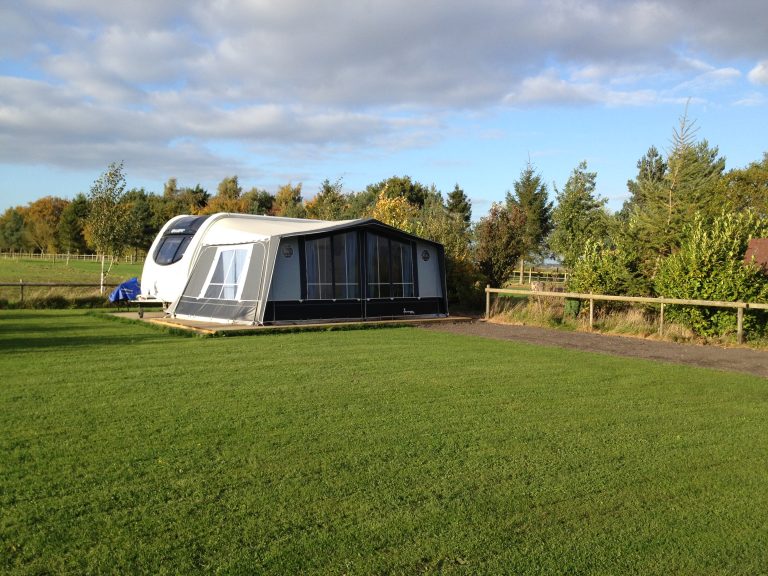 All our spacious seasonal pitches are hard standing concrete pads, big enough for caravan and awning, surrounded by well maintained grass and beautiful views. Each pitch has its own gravel parking area so that it